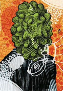 Er fertigt Arbeiten wie Zeichnungen, Siebdrucke und Collagen.