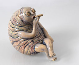 Ihre Skulpturen sind bizarr und anthropomorph. Wenn sie mit Ton arbeitet, folgt sie der Form, die in ihren Händen entstehen, verfeinert sie, beobachtet sie und verändert sie, bis eine neue Kreatur ihr Wesen offenbart, ohne vorherige Skizze auf Papier.